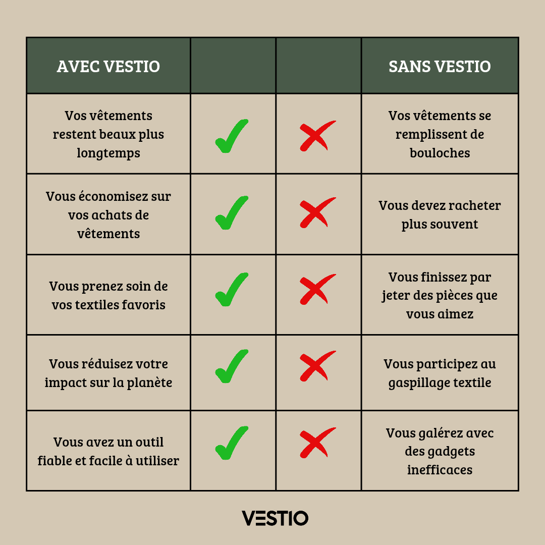 Prolongez la durée de vie de vos vêtements, économisez sur vos futurs achats et adoptez un geste simple pour la planète. Sans VESTIO™, c’est des vêtements abîmés, des dépenses inutiles et un impact écologique qui s’alourdit. Faites le bon choix dès aujourd’hui !